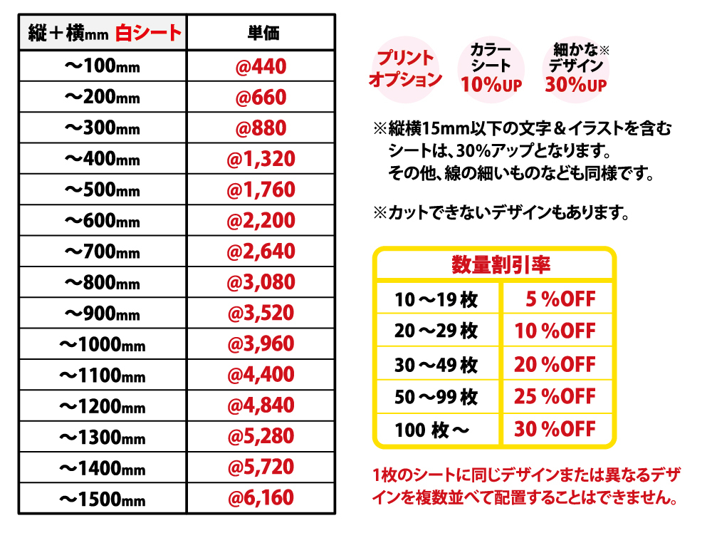 PRICE プリント価格 ※価格は全て税込です シルクプリント 転写プリント カッティングプリント 刺繍 キャップ マグカップ 缶バッジ ユニフォームストラップ タオル ステッカー カッティングシート のぼり 名刺・カード はがき チラシ カッティングシート Web上での表現につき、実際の色と多少色味が違う場合があります。ご了承下さい。 デザイン加工料については、完全版下データによるご入稿または文字のみのデザインを除き発生します。ライブトレース¥1,100/トレース・デザイン制作¥2,200〜/複雑なものは別途お見積りとなります。 カッティングシート価格算出方法