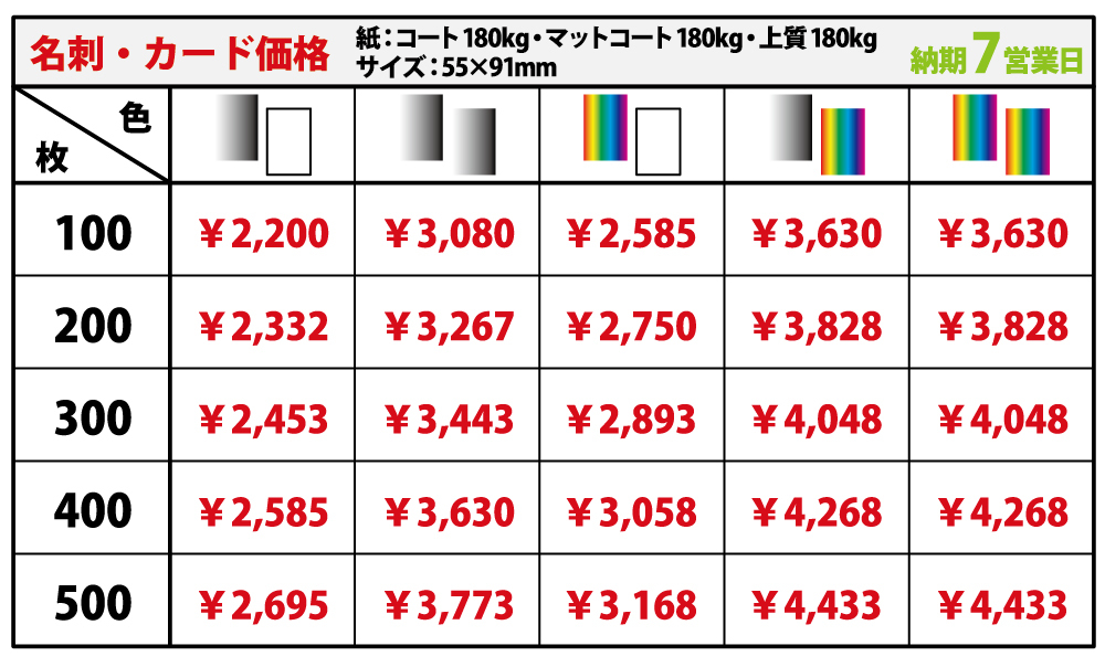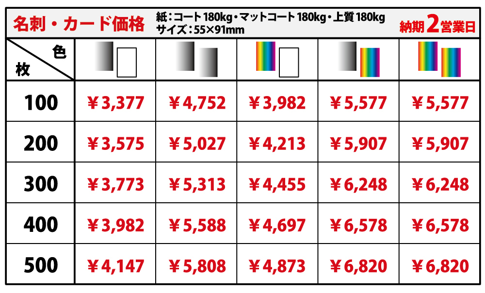 PRICE プリント価格 ※価格は全て税込です シルクプリント 転写プリント カッティングプリント 刺繍 キャップ マグカップ 缶バッジ ユニフォームストラップ タオル ステッカー カッティングシート のぼり 名刺・カード はがき チラシ 名刺・カード デザイン費は別途かかります。 用紙変更は追加料金が必要になる場合があります。 名刺・カード価格算出方法