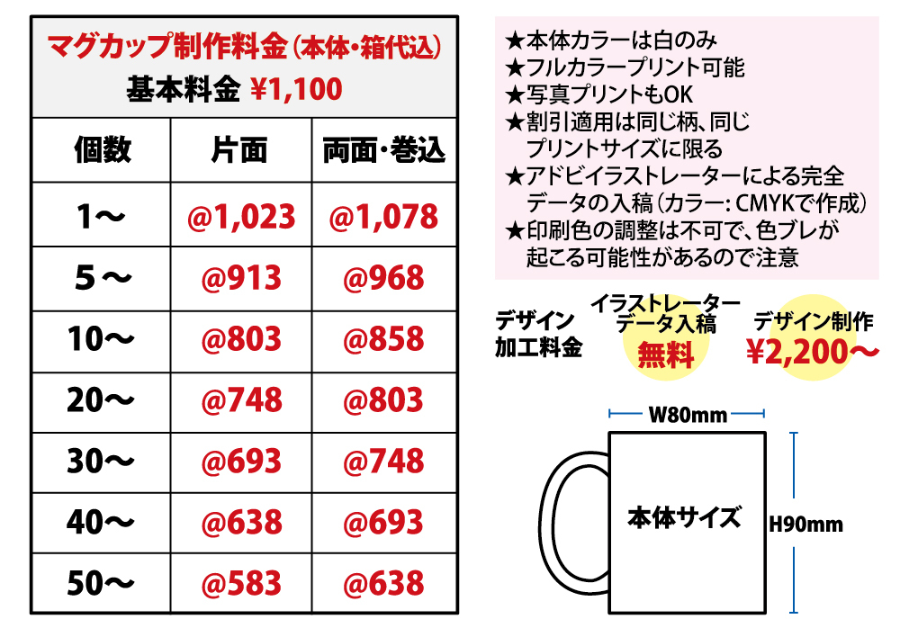 PRICE プリント価格 ※価格は全て税込です シルクプリント 転写プリント カッティングプリント 刺繍 キャップ マグカップ 缶バッジ ユニフォームストラップ タオル ステッカー カッティングシート のぼり 名刺・カード はがき チラシ マグカップ アドビイラストレーターによる完全データの入稿(カラー: CMYKで作成)となります。 印刷色の調整は不可で、色ブレが起こる可能性もありますのでご了承ください。 デザイン加工料については、完全版下データによるご入稿または文字のみのデザインを除き発生します。ライブトレース¥1,100/トレース・デザイン制作¥2,200〜/複雑なものは別途お見積りとなります。 マグカップ価格算出方法