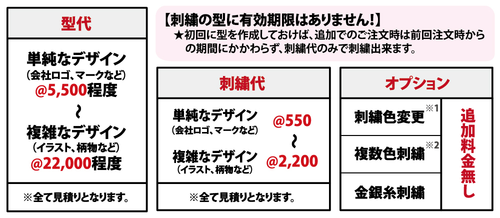 - 型代、刺繍代はデザインによって大幅に変動しますので、大体のデザインが決定してからの見積りとなります。